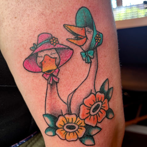 I'm Ingrid (she/they), a tattoo artist who began my professional journey in 2018 after apprenticing under Jenny Vidovic. I create bold, illustrative work across a range of styles—including American traditional, floral pieces, black dot work, and fine line. I love designing tattoos with a nostalgic or playful feel, and I do my best work when clients give me a loose idea and trust me to bring it to life in my own style.